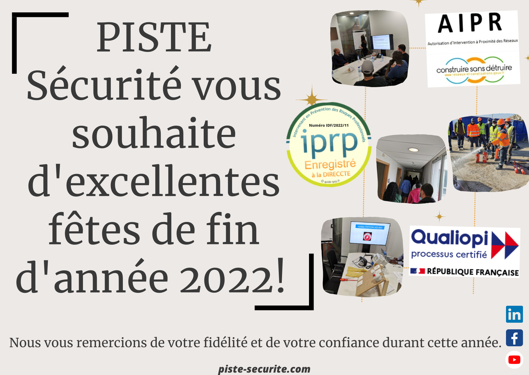 Excellentes fêtes de fin d’année 2022 ! Publié le 23/12/2022 Toute l’équipe PISTE Sécurité vous souhaite d’excellentes fêtes de fin d’année 2022 ! Nous vous remercions de nous avoir suivi tout au long de cette année.